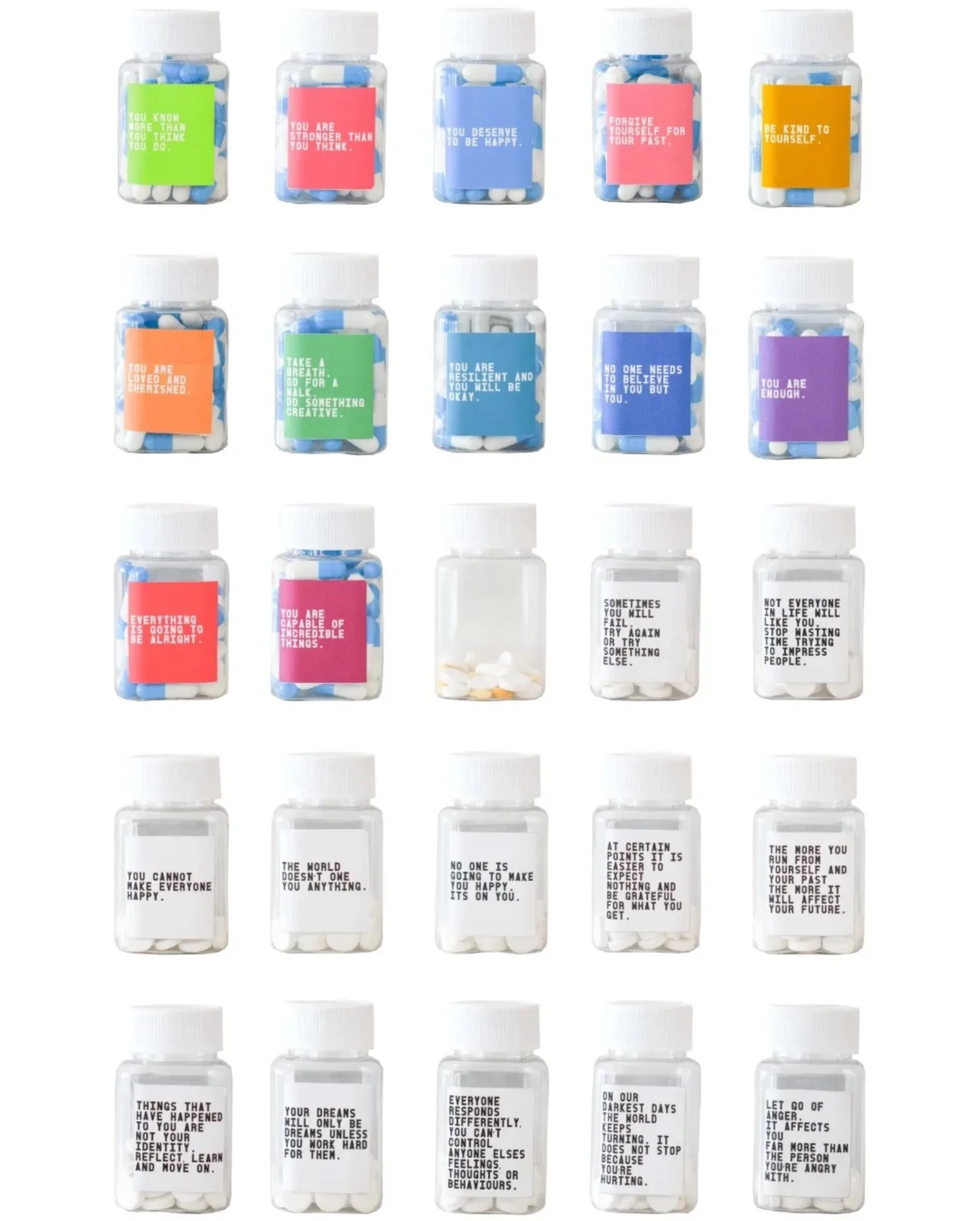 The colourful pill bottles are positive affirmations that I taught myself to believe, thoughts that I force myself to replay every day.